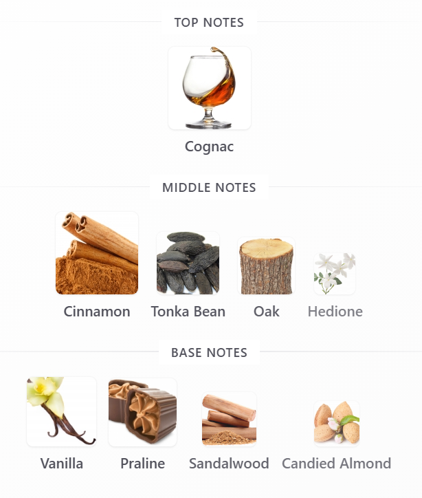 "Angels' Share contains the essence of Cognac derived from the liquor to lend it a natural caramel color. Opening with cognac oil, upon a blend of oak absolute, cinnamon essence and Tonka bean absolute, the scent's long-lasting notes of sandalwood, praline and vanilla make for a delicious finish, a rare concoction only angels should experience."