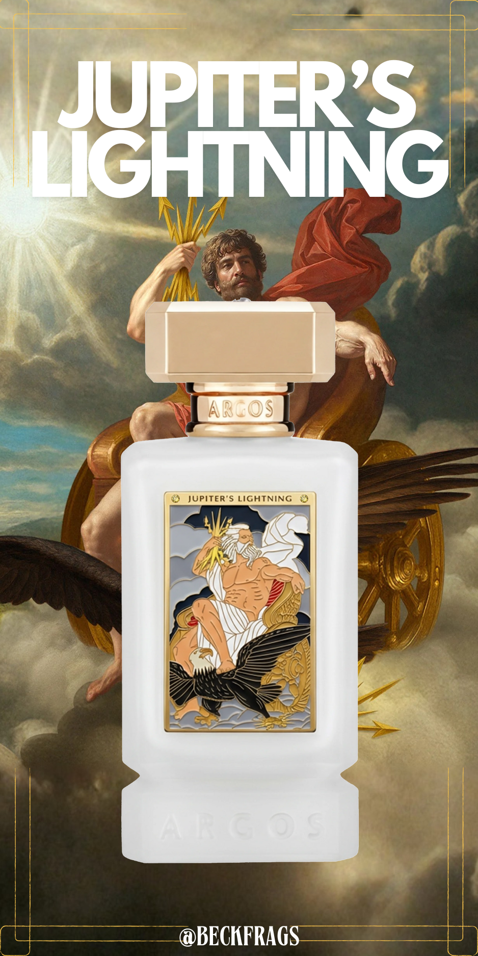 "Jupiter's Lightning opens with a dazzling strike of Cardamom, Juniper Berries, Lemon, and Bergamot. A poised heart of Clary Sage, Orris, Saffron, and Tea rolls like thunder across Mount Olympus. The scent grounds itself in Cypress, Atlas Cedar, and Musk, symbolizing eternal strength, as unyielding as Jupiter's mighty thunderbolt."