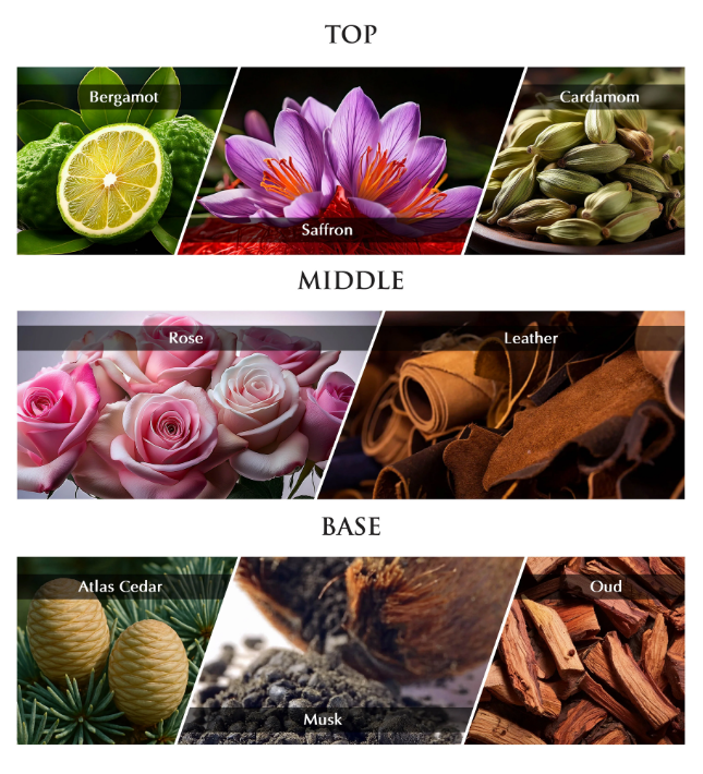"Perseus Triumphant symbolizes the heroic victory of Perseus over Medusa. It opens with a vibrant blend of Bergamot, Saffron, and Cardamom, then leads into a bold heart of Rose and Leather. The scent settles into a profound base of Cedar Atlas, Musk, and Oud celebrating this triumphantly epic fragrance."